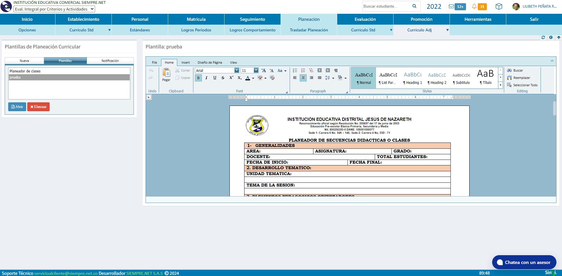 - Planeación Curricular con documento adjunto editable en formato Word, permitiendo a los docentes utilizar y editar su planeación directamente en la plataforma SINAI.